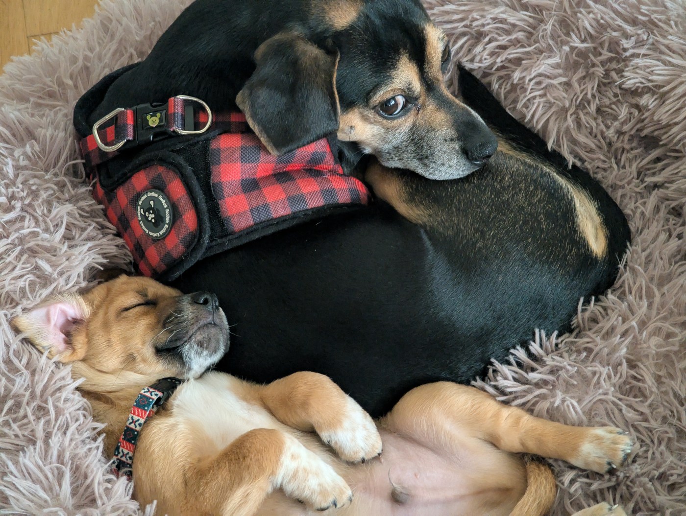 Meanwhile, in Southern Indiana where it is very cold, we have a 9-week-old male chihuahua/beagle puppy learning the ropes from our 2-year-old male dachshund/beagle/minpin, who sleeps in the bed with us because this is the way of his people.