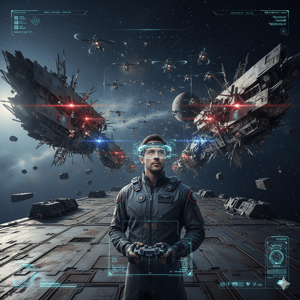 Glenn Mehrenholz stood at the center of his augmented reality playground on Ghost Town deck, flying a covey of drones through Iron Arrow Vidura’s scrap orbit.